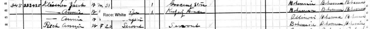 Shortly after arriving in America in 1871, Jacob Klaisner married fellow Czech immigrant Anna Fiala in Chicago. He was a cooper (barrel-maker) by trade, but eventually became a grocer, opening a store on 26th St. He and Anna had a daughter Anna Maria in 1878. Unfortunately, tragedy struck the family when in 1883 Jacob committed suicide. Anna continued to operate the grocery store for many years. Her daughter married and had three daughters, from whom there are descendants living today.
